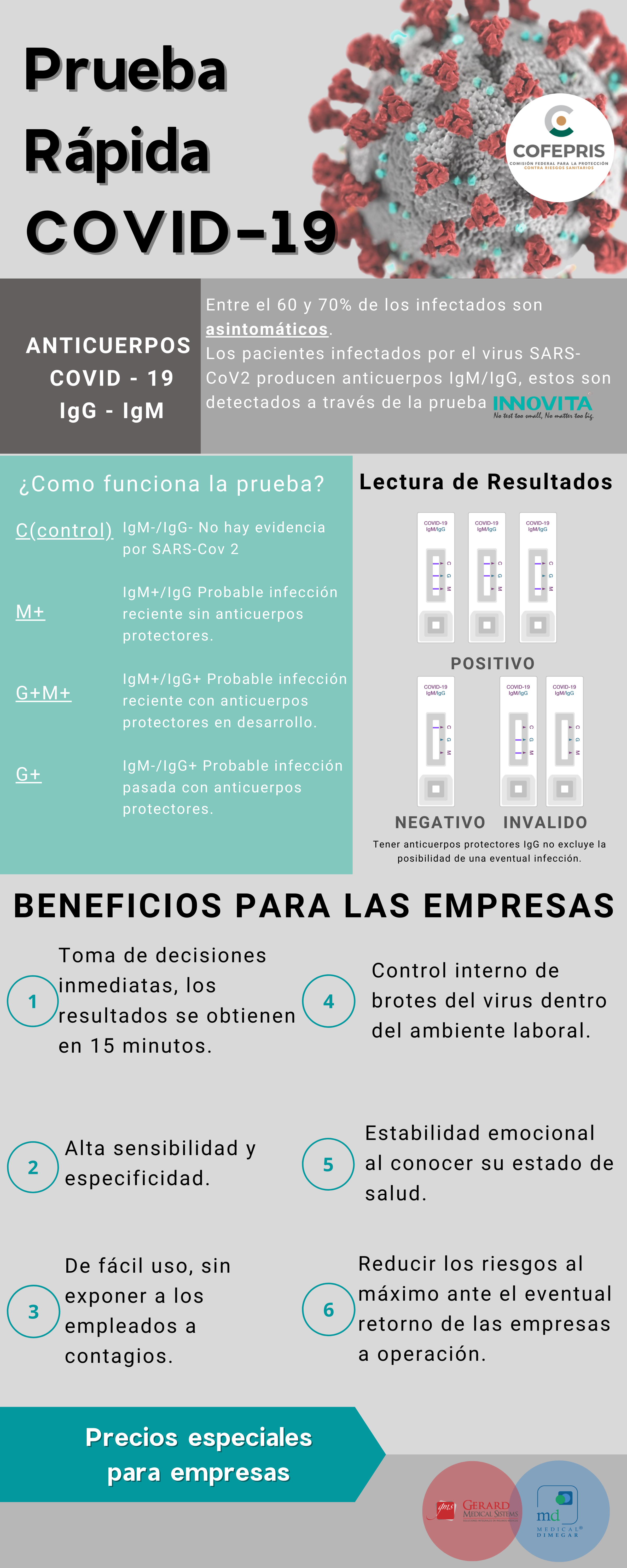 Marca reconocida mundialmente. El convenio con el fabricante es manejar precios preferenciales para México. Su capacidad de Producción es de : 150,000 piezas diarias para Covid-19. Cuenta con certificación NMPA (Administración Nacional de Productos Médicos) SUNGO , CE ISO 13485:2016 EUROPE , FDA 2020-483, COFEPRIS CAS/DEAPE/3390/2020 Marca china líder en detección combinada de patógenos respiratorios